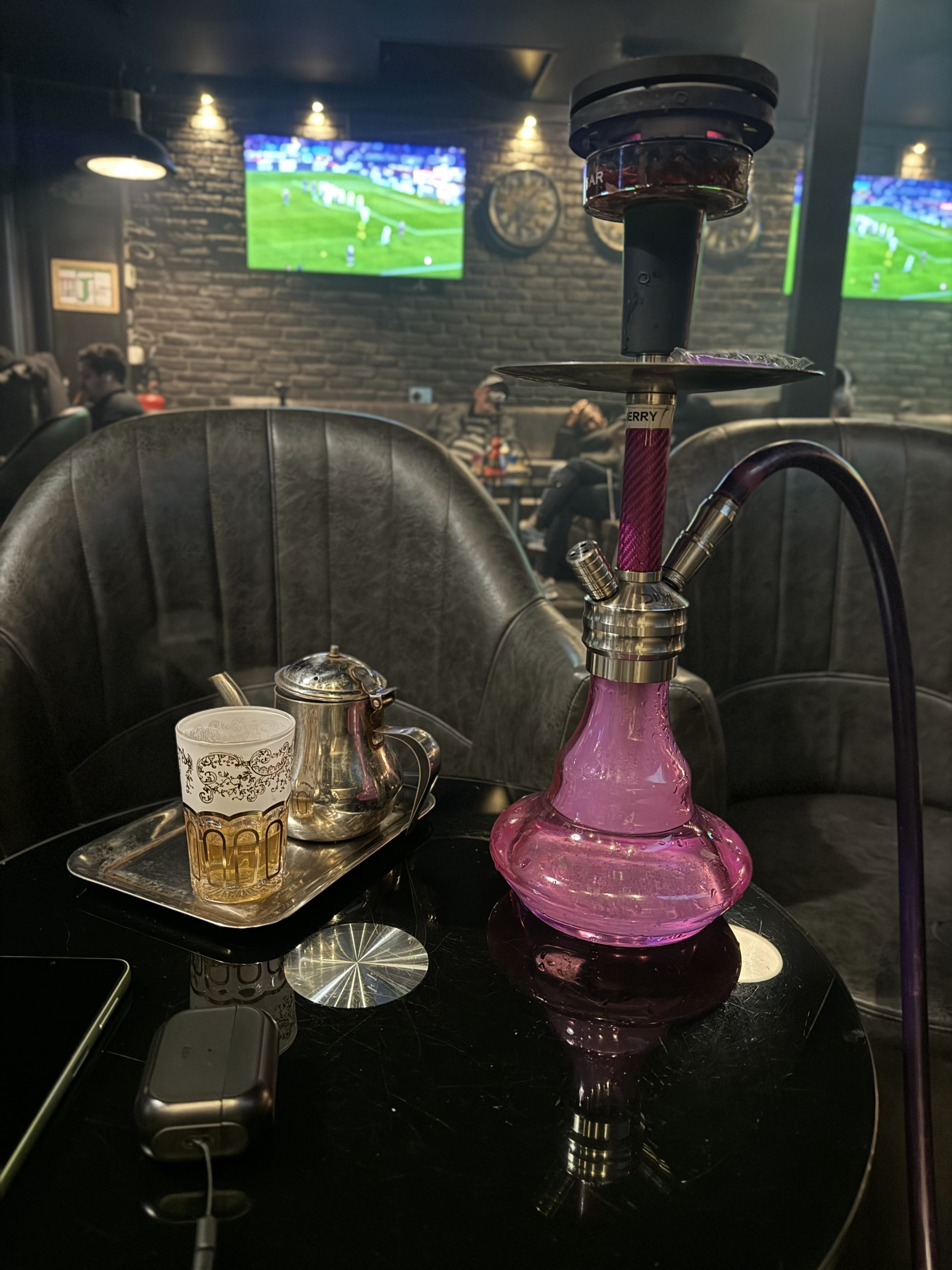 Bon café à narguilé. Endroit idéal à visiter si vous souhaitez assister à un match de football. Les prix sont abordables. Mais l'endroit ne propose aucune nourriture à part des boissons.